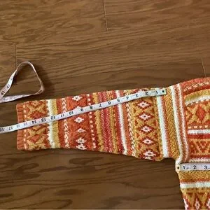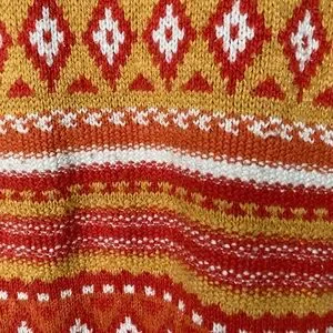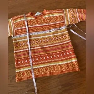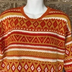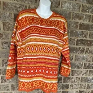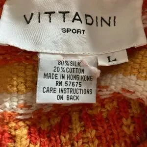 This Vintage Vittadini Sport Women's Knit Sweater in size Large is a stylish and unique addition to any wardrobe. Made of 80% silk and 20% cotton, this Aztec-patterned sweater features a cable-knit style, 3/4 sleeves, and a crew neck neckline. The orange and white color combination adds a pop of color to any outfit, while the heavyweight fabric makes it perfect for the winter, fall, and spring seasons. Whether you're traveling, attending a party, or looking for a casual or business outfit, this sweater is sure to stand out with its vintage appeal and sporty theme.