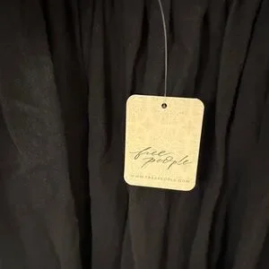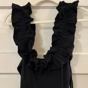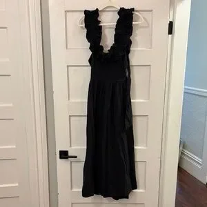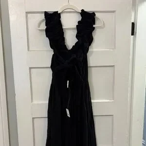 Free People midi dress with deep ruffled V-neck. Sleeveless design with gathered waist. Flowy skirt for easy movement. Versatile black for day or night.