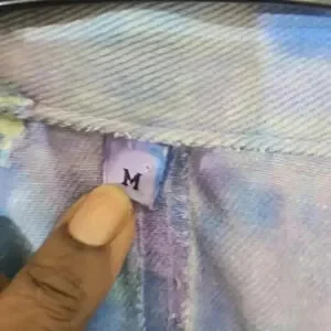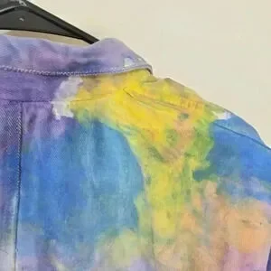 This vintage denim jacket features a unique fringe detail and vibrant tie-dye pattern, making it a statement piece for any wardrobe. In excellent preworn condition, this jacket was purchased from an estate sale and does not have any tags.