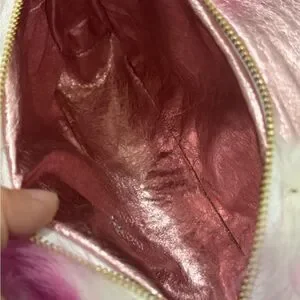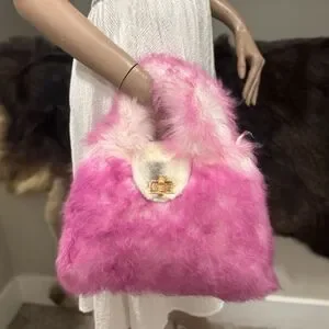 One of a kind. Uniquely beautiful real lamb fur bag. Handmade from genuine Lamb fur, beautifully dyed gradient 2 tone color, overall full fur design. Includes 1 leather strap for crossbody. Spacious enough for your phone, cosmetics, wallet, compact umbrella and other items. It's perfect for casual wear, or a gift for an important someone.