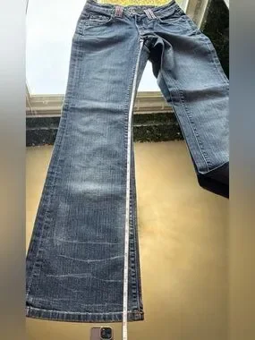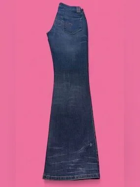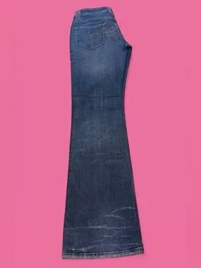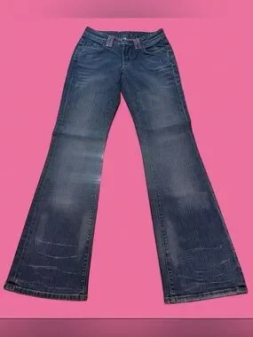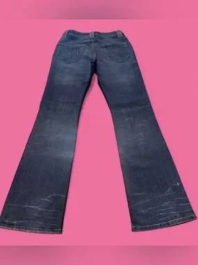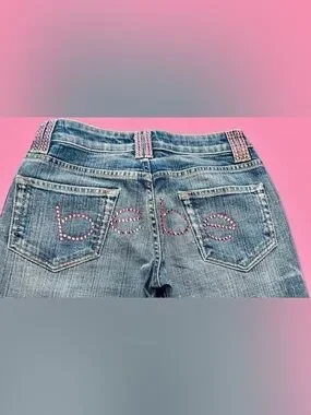 bebe Blue Denim Bootcut Jeans with Pink Rhinestone Logo