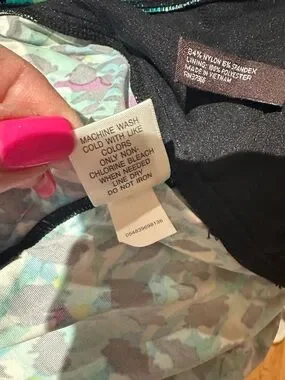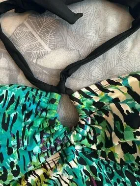 Dana Buchman halter-style swim top. Black base with green and turquoise leopard-like print accents. Keyhole center with tie neck. Smooth swim fabric and clean lines. Padded bra. Side ruching.