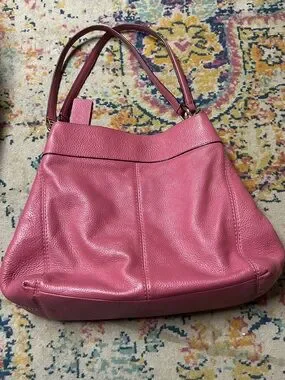 Coach pebbled leather shoulder bag in a bright pink shade. Features double straps with gold-tone hardware. Soft, structured silhouette for everyday wear. Classic Coach logo on front.