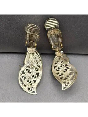 Complete your vintage look with these striking West German clip-on earrings, featuring vibrant teardrop-shaped cobalt blue art glass. The stones are cradled in exquisite, multi-layered nickel silver filigree that showcases the delicate "wire-work" technique famous in mid-century German jewelry houses. Lightweight yet impactful, these earrings offer a secure fit and a bright pop of color, making them an essential addition for collectors of authentic European vintage accessories. Signed "Germany" on the clips for authenticity.
