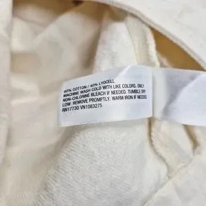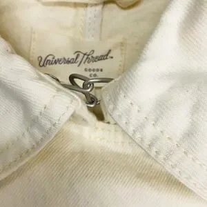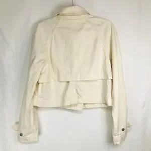 Universal Thread cropped moto-style jacket in an ecru white twill. Crafted from a comfortable cotton and lyocell blend, this lightweight layer features a double-breasted button front, notch lapels, and long raglan sleeves with button-tab cuffs. The back is designed with a stylish storm flap and a small vent at the hem, while the front includes functional side pockets. Perfect for transitional weather, this utility-inspired piece offers a modern, boxy silhouette.