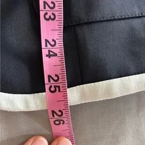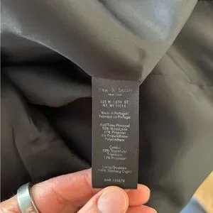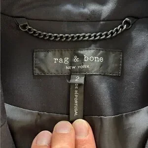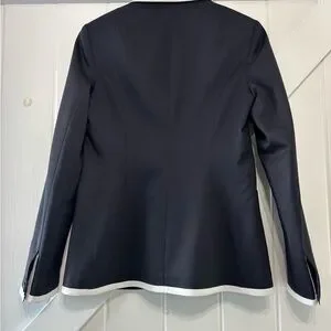 Chic rag & bone navy blazer featuring crisp white contrast trim, a tailored three-button front, and classic patch pockets. Made in Portugal from a quality wool-blend fabric and fully lined for a polished, structured fit. Perfect for work, events, or elevated everyday style. Excellent used condition. Dry cleaned and ready for its new owner. Please note model is AI generated and used to show how item can be worn. See all pictures for details.