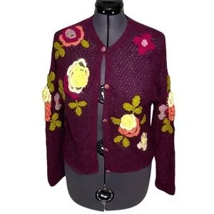 Vintage Crochet Floral Cardigan Purple Appliqué Boho Cottagecore Sz M