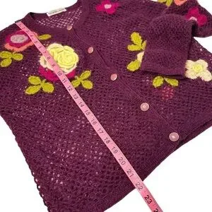 Vintage crochet cardigan in rich purple featuring hand-appliqué floral detailing, open knit construction, and a soft lightweight feel size medium. Beautiful vintage statement cardigan with intricate crochet knit and colorful floral appliqué accents.