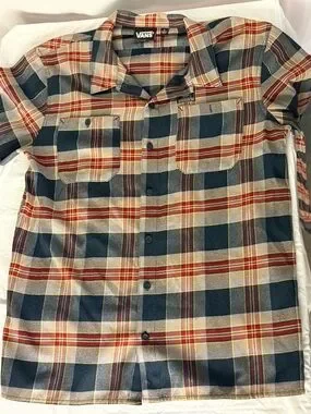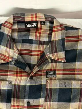 Vans plaid flannel button up shirt in men’s size Large. Red, tan, and black plaid pattern with Vans logo patch on chest pocket. Great casual skate style flannel, perfect for layering or everyday wear.