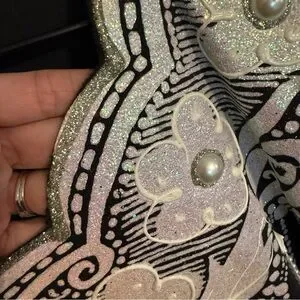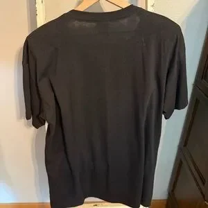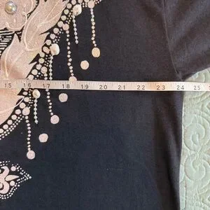 Stylish black t-shirt with intricate white embellishments. Perfect for a bold look. Super cute and funky t-shirt! See pics for measurements. OS doesn’t actually fit everyone in the world. 80’s inspired! Removable shoulder pads. One light mark of paint on bottom of shirt. Other than that, great condition.