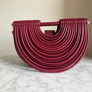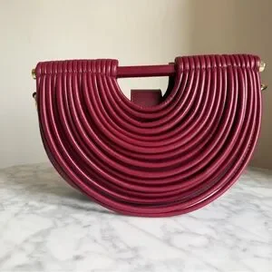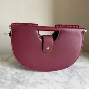 Sculptural half-moon shoulder bag in rich burgundy. Textured ribbed design delivers modern style and visual interest. Sleek top handle and detachable strap options for versatile wear. Burgundy color adds a sophisticated pop to any outfit.