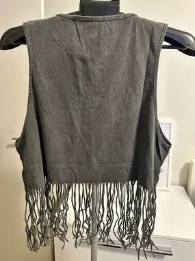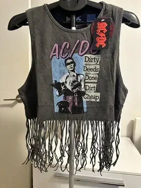 AC/DC XL Black Fringe Tank Top Graphic Vintage Ladies Babydoll Tassel Vest