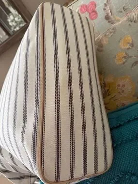 Design: Crafted from heavyweight cream ticking stripe canvas with a bold red interior trim and navy blue stripes.