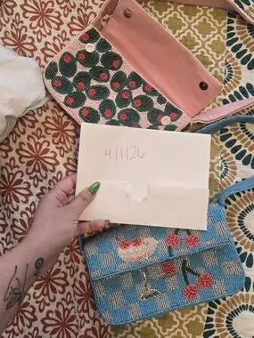 Chunky beaded shoulder bag with a blue checkerboard base. Features pink cherry appliqués with green stems. Structured flap closure and fabric strap. Playful, vintage-inspired design.
