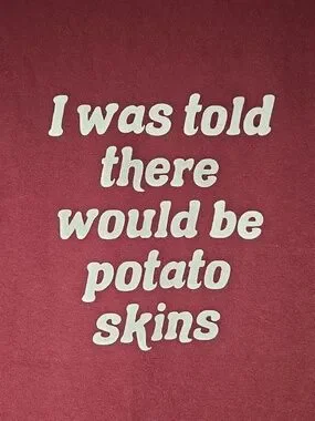 Comfortable maroon short-sleeve tee with a playful white graphic: "I was told there would be potato skins." Soft cotton feel and a relaxed fit. Easy to pair for casual outings and lounging. Graphic adds humor and personality to your wardrobe.