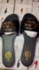 Sleek black slide sandals featuring a polished gold double-emblem detail. Soft cushioned footbed for comfortable all-day wear. Easy slip-on style for quick outfit updates. Versatile black and gold look pairs well with casual or dressy ensembles.