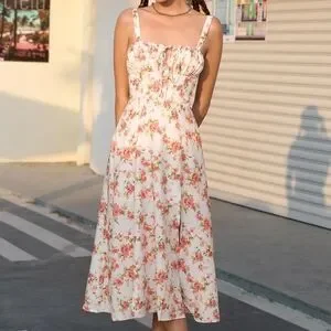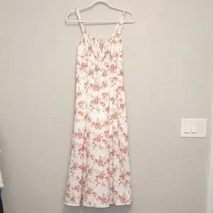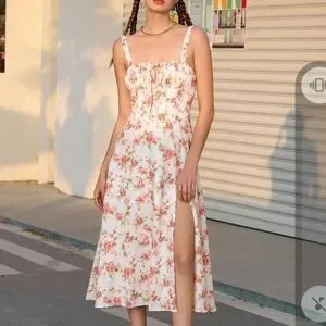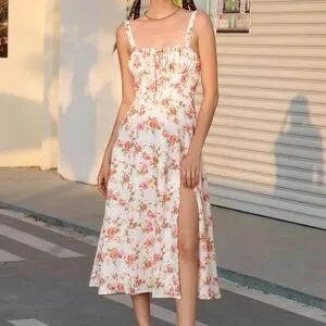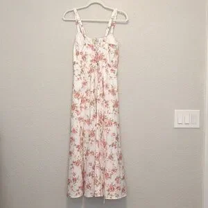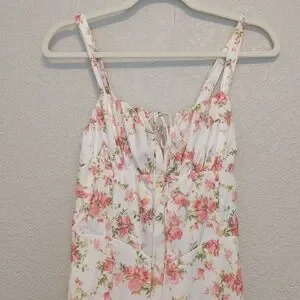 Parthea white pink floral sleeveless basque waist lace up thigh slit maxi dress