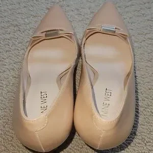 Chic pointed-toe pumps by Nine West. Patent leather upper with a bow and metal accent. Sleek low heel and classic silhouette. Versatile neutral shade for many outfits.