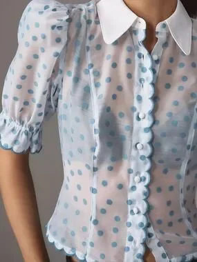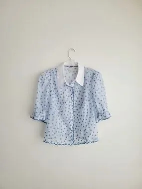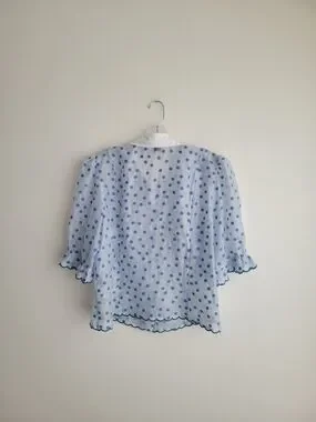 Lightweight blue polka dot blouse with delicate scalloped hem and sleeve trim. Features a soft collar and airy silhouette for comfortable layering. Perfect for casual or dressy looks in blue.