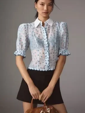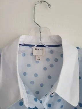 MAEVE by Anthropologie Blue Puff Shoulder Collared Polka Dot Sheer Blouse