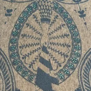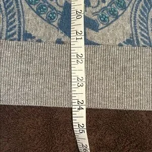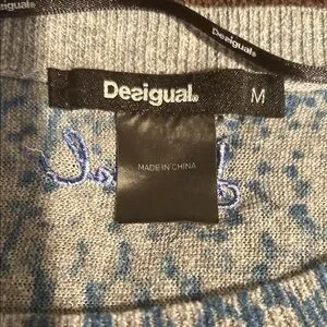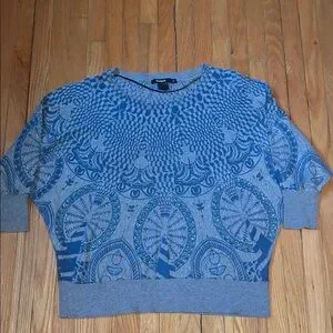Desigual women's crewneck sweater. Size medium. Blue and gray patterned knit with decorative motifs with rhinestone embellishments. Short dolman sleeves and ribbed hem and cuffs. Subtle sequin accents on front. Comfortable relaxed fit. Good used condition. Smoke free and pet friendly home.