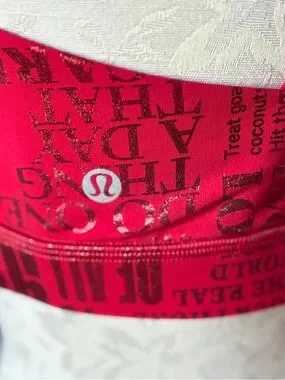 This is a limited edition sports bralette from lululemon athletica. It features red foil metallic text print across the front. Wide straps and elastic underband for stable fit. Smooth stretch fabric for movement and comfort. Stylish for workouts or casual wear.