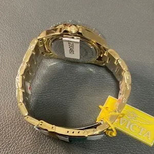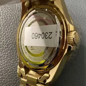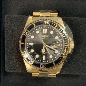 Gold-tone stainless design with a black dial. Rotating bezel with gold numerals. Luminous markers and hands. Date window at three o'clock. Sporty, refined appearance.