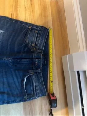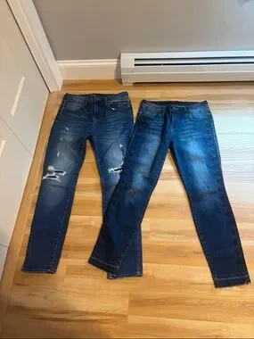 Two pairs of dark wash skinny jeans. One with front distressed knee detailing. One with stitched/embroidered side panel accents. Classic five-pocket styling. Comfortable stretch denim look.(Size are 30, 28)