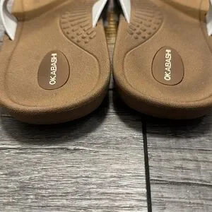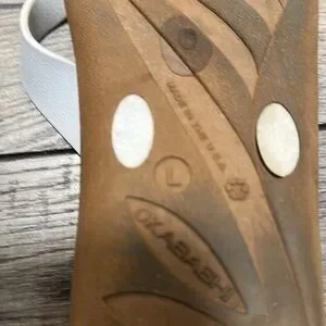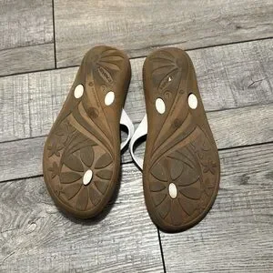 Okabashi flip flops with white straps and neutral color bottoms