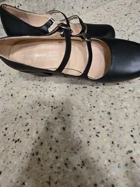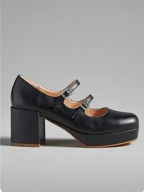 Sleek black Mary Jane with three adjustable straps. Chunky block heel and slight platform for stability. Smooth leather-look upper with rounded toe. Versatile, polished design for day or night.
