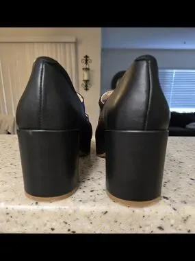 Approx. 3" heel and 1" platform. The upper and insole are made of smooth black leather with durable rubber sole.