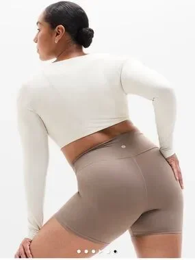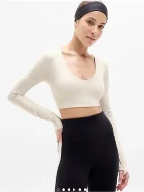 This cream long sleeve scoop-neck crop top by Athleta is the perfect alternative to a classic sports bra for yoga flow, a gym sesh, lounge, and everything in between.