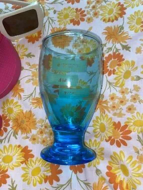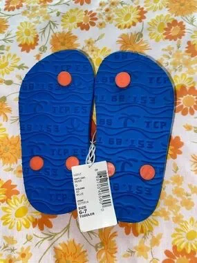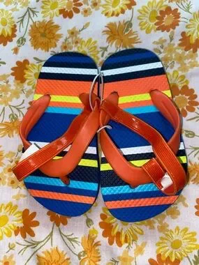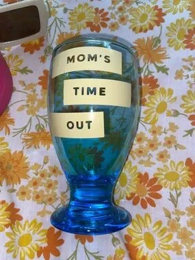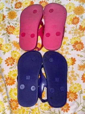 Ha! This cracks me up. One Mom’s Time Out blue glass, one cream rectangular pair of sunglasses, one The Place NWT unisex striped sandals size 6-7, one pink Old Navy flip flops sandals size 7 and one Old Navy purple pair of sandals size 7. No brand on glass or shades. Pink and purple shoes are very gently preloved. Smoke free home.