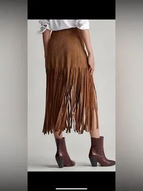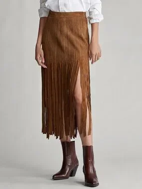 Ralph Lauren suede midi skirt with long fringe. High waist silhouette with a front slit. Soft suede texture for fluid movement. Boho-inspired look that pairs well with boots or tucked tops.