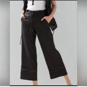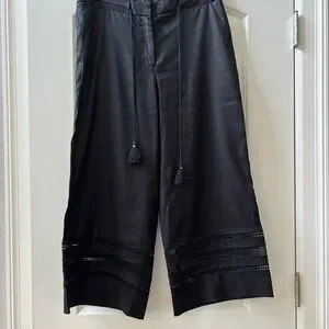 These are gorgeous pants. Like new condition. Pretty tie detail at waist. Lace details at ankle. Wide leg crop. Linen blend. True black. Seize 8. See pics for measurements