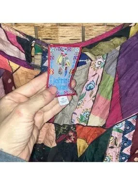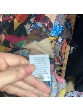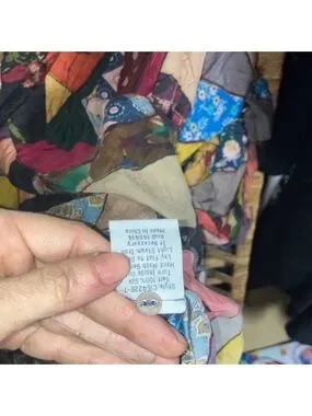 Bold patchwork pattern in a relaxed short sleeve silhouette. Mix of geometric and floral fabric panels. Easy, breezy fit ideal for casual outfits. Statement top that pairs with denim or tailored pants.