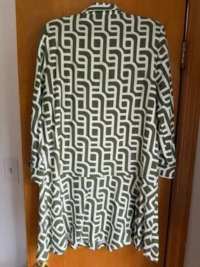 Zara long sleeve dress with bold geometric print. Olive green and white colorway. Button-front with a subtle collar. Relaxed, slightly A-line silhouette. Modern vintage-inspired look. Worn once - great condition.