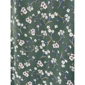 * Print: Ditsy floral — sage/forest green base with scattered white flowers, purple buds, blue and tan stems