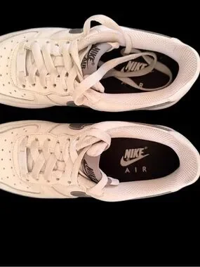 Stylish Nike Air Force 1 low-top sneakers in cream with a gray swoosh. Smooth leather upper provides a clean, classic look. Cushioned midsole delivers all-day comfort and support. Versatile cream and gray colors pair easily with everyday outfits.