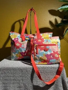 Complete 3 piece Coach travel set in a gorgeous bright floral print. This set includes the large Getaway nylon weekender with its matching removable clip-in pouch, plus the matching floral file bag crossbody.