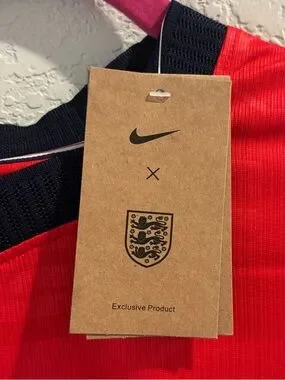 Team England Palmer World Cup 26 soccer Jersey shown with original tag. Vibrant red body with navy collar and trim. Team crest visible on chest. Size on Jersey is XXL but fits more like a large/XL.