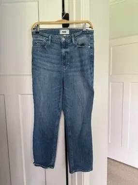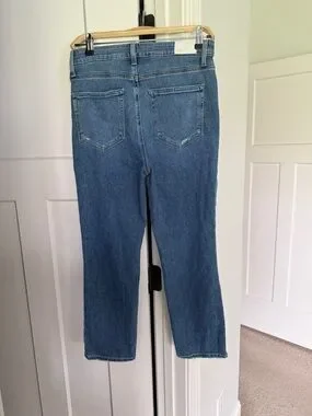 Straight leg silhouette with a mid-rise waist. Classic medium blue denim with subtle fading. Clean five-pocket styling. Comfortable and versatile for daily wear. High rise, cotton stretch blend, Great pre-owned condition and smoke free home