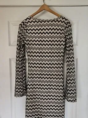 Chelsea & Violet chevron dress with a V-neck. Long sleeves and a relaxed fit. Bold black and tan zigzag pattern. Lined body.