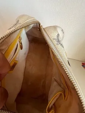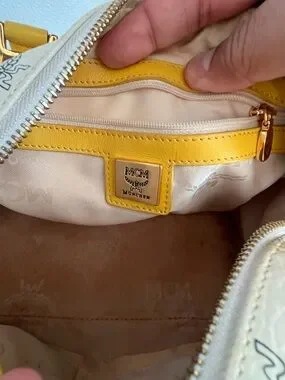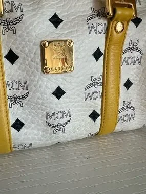 Authentic MCM satchel in white Visetos canvas. Yellow leather handles and trim provide a sunny contrast. Gold-tone logo plaque and hardware accent the front. Top zip closure and double handles for easy carry. Stylish and eye-catching for daily wear.