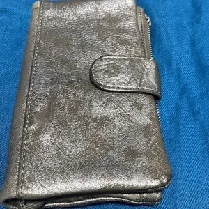 Good condition Fossil wallet, has a distressed look overall and one spot inside appears worn as pictured. 2 change zip up sections, button closure. Soft leather.