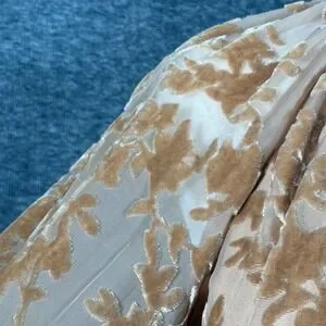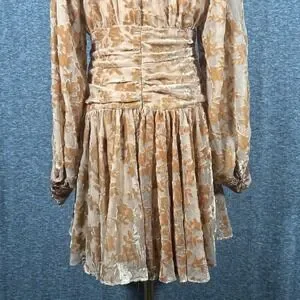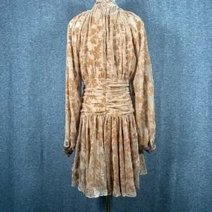 Luxe devoré velvet mini dress in a rich Brown Sugar hue features an intricate floral burnout pattern throughout. Designed with a sophisticated mock neck and a daring keyhole cutout, this long-sleeve piece boasts a flattering smocked waist with metallic button accents and a flowy tiered skirt. The sheer sleeves and partially lined body create a beautiful play of texture and transparency, perfect for cocktail parties or special evening events.