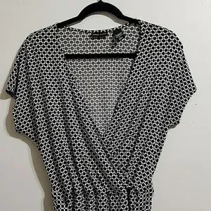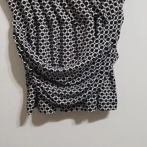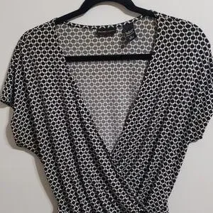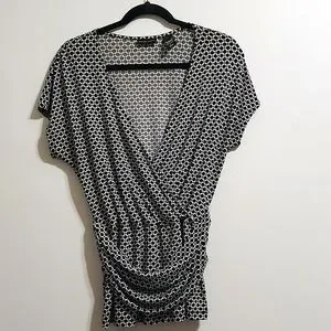 Faux wrap top with affixed ruching band around waist area -.(great for tummy concealing!)