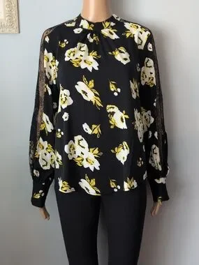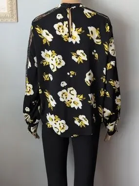 Cleo Black & Yellow Floral Blouse with Lace Sleeve Inset - Size M