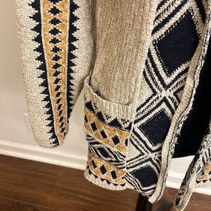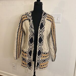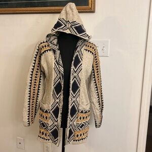 Lucky Brand BoHo Southwestern Aztec Textured, Open Front Cotton Cardigan w/Pockets and Hood, Sz. S. No flaws or damage. Please see the statement on the tag concerning any intentional fabric alterations via the company. An excellent addition to any closet.