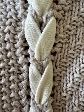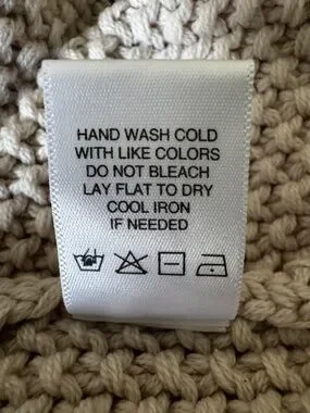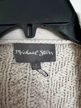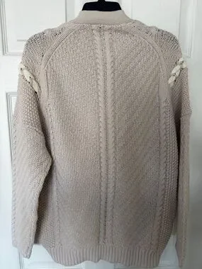 Cute, soft and comfy relaxed Cardigan from Michael Stars. Gorgeous neutral beige with an ecru cotton ribbon woven through the front. Varied woven pattern. The cardigan is cotton/acrylic no wool. The front is about 24" from the shoulder to hem and the back is slightly longer. It is size S but very relaxed and designed to be slightly oversized. Feels like lovely soft cotton.